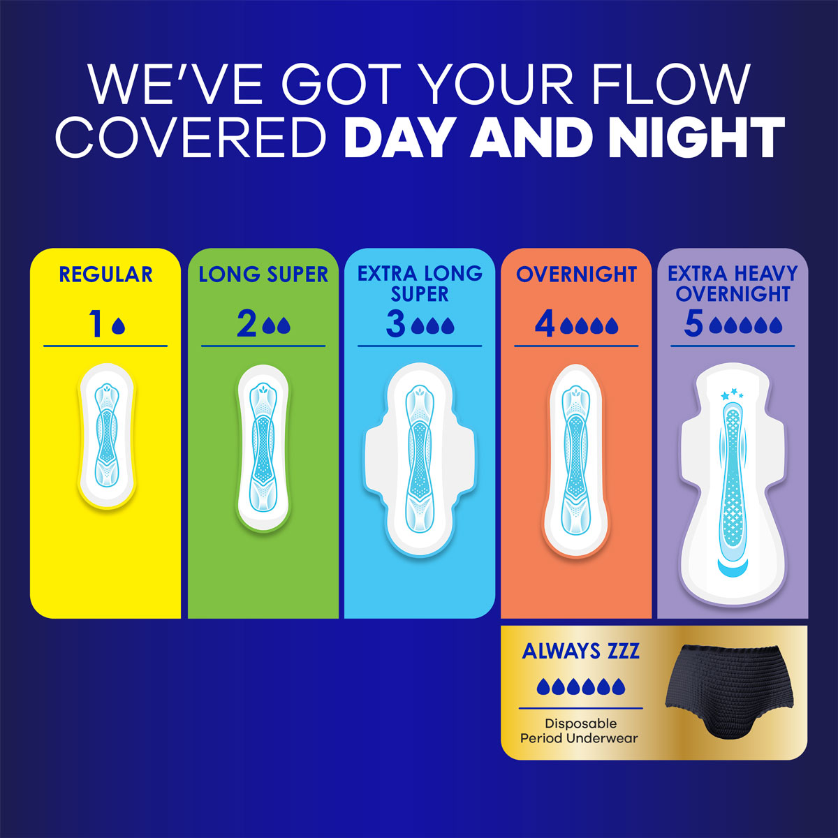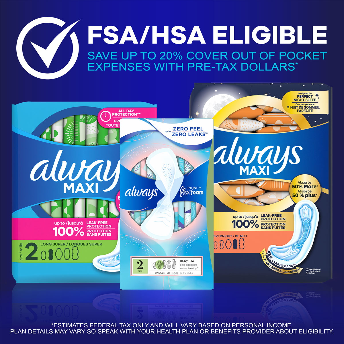 Rest easy with up to 100% leak-free comfort from the Always Maxi overnight pads. The pads feature 3X Protection System for all night protection, while RapidDRY works to wick away gushes fast to absorb more than you may need. Plus, the LeakGUARD core locks in leaks for long-lasting protection, while SecurelyFITS helps the pad stay in place. Always Maxi Overnight Size 4 Pads Unscented without Wings feature a 45% larger back*, for a Perfect Night Sleep. Sleep tight with Always Maxi Pads.